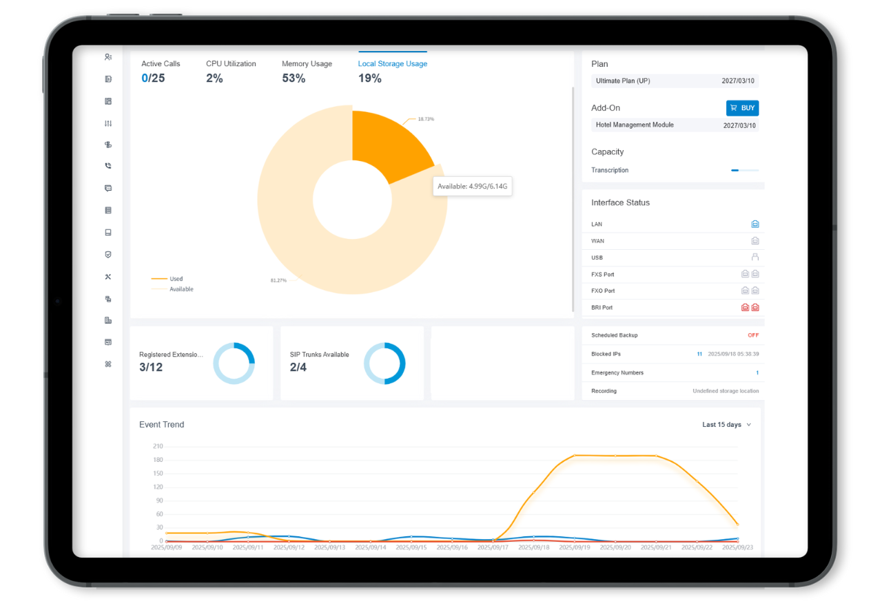 Il pannello principale per gli amministratori PBX offre una panoramica chiara e in tempo reale sullo stato del sistema: puoi vedere subito se tutto funziona correttamente, controllare chiamate attive, memoria, spazio disponibile, linee attive e l’uso dell’app.